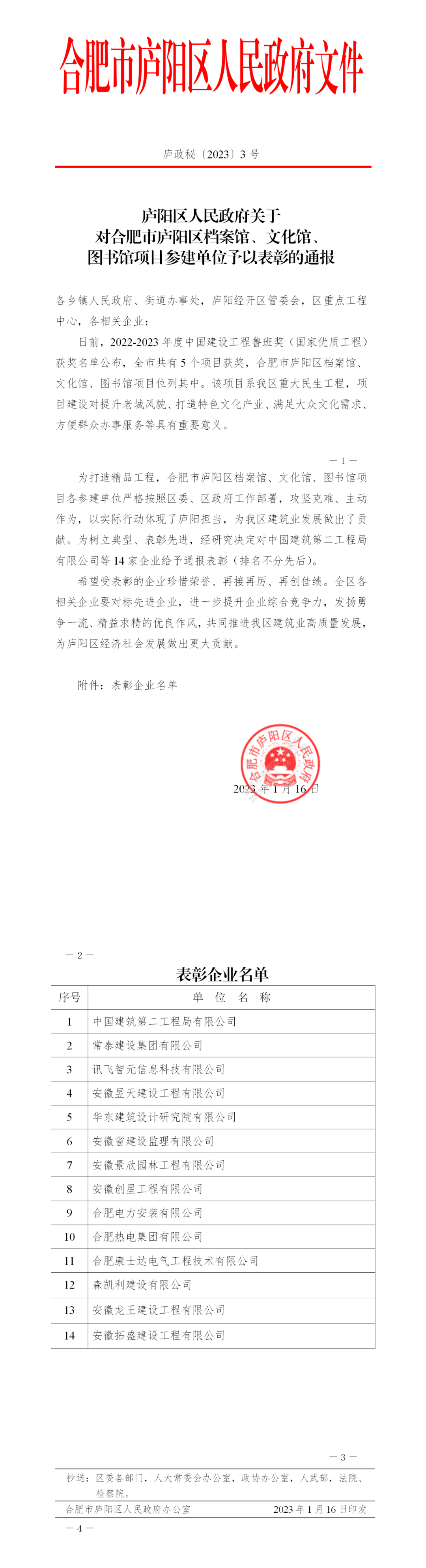 庐阳区人民政府关于对合肥市庐阳区档案馆、文化馆、图书馆项目参建单位予以表彰的通报!